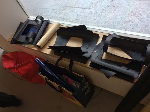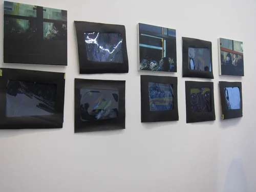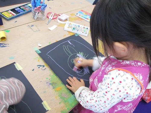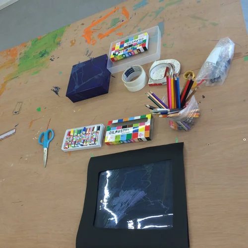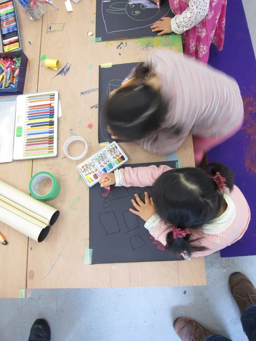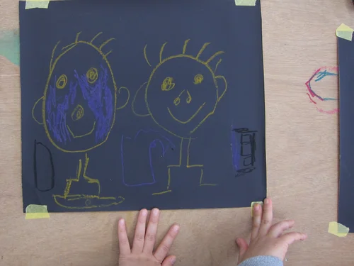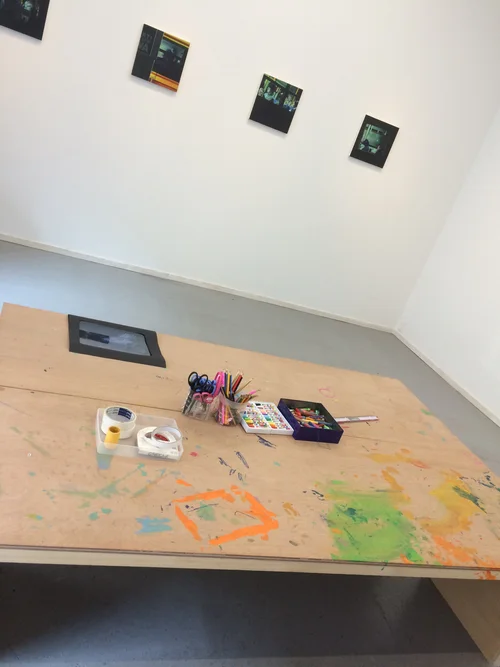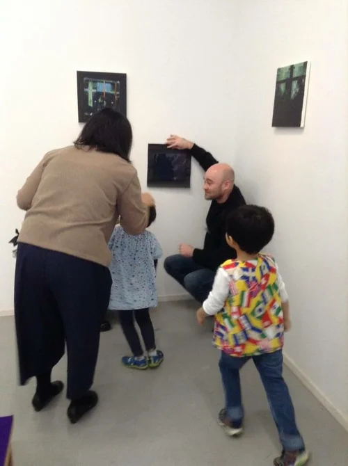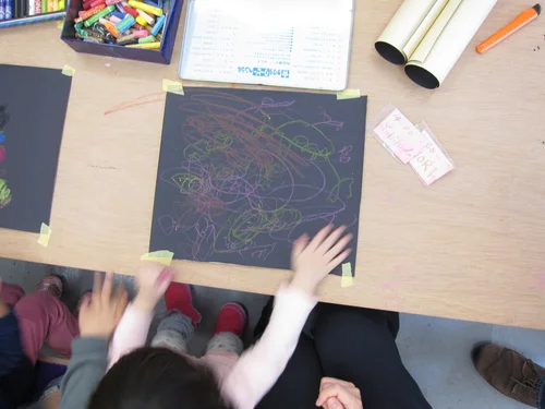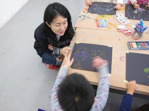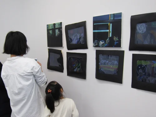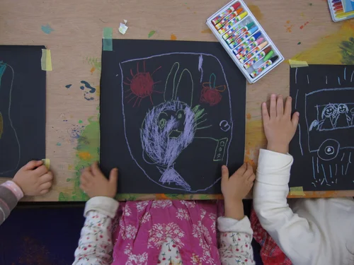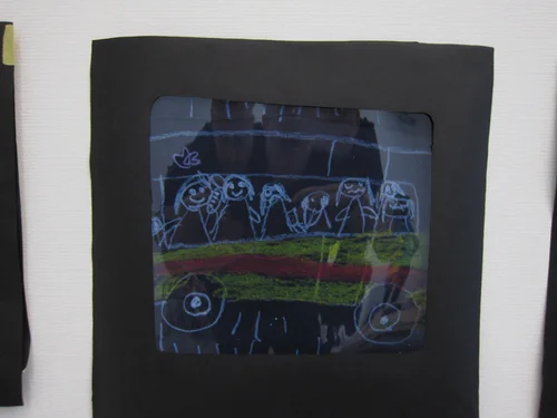 In this photo one child is describing an artwork whilst the others guess which picture it is.